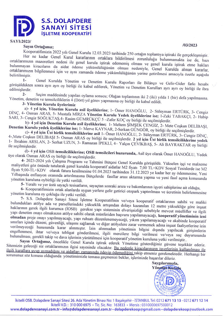 12 Mart 2023 Tarihinde Yapılan 2022 Olağan Genel Kurulumuzda Mevcut Yönetim Kurulu Oy Birliğiyle Yeniden Seçilmiştir.